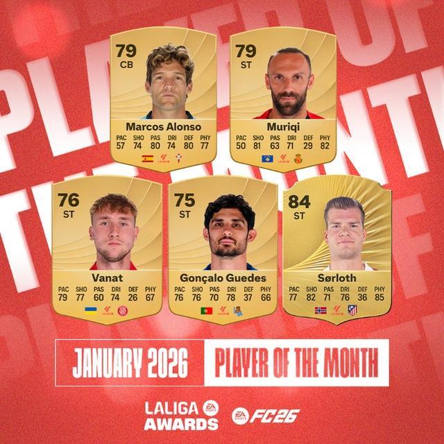 北京时间1月22日,西甲1月最佳球员候选名单公布,这5名球员为马科斯-阿隆索、穆里奇、瓦纳特、贡萨洛-格德斯、瑟洛特。